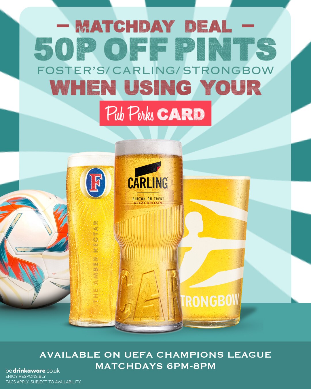 50p off Carling, Fosters & Strongbow on Champions League Matchdays 6pm – 8pm